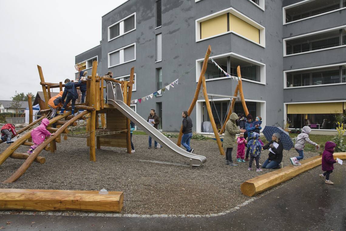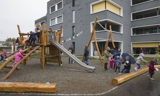 Der Aussenraum wurde zusammen mit den Bewohnenden entwickelt und durch einen Spielplatzbauer gebaut. Am gemeinsamen Bautag im Herbst 2018 halfen Jung und Alt mit. Der Quartiertreff bietet Platz für 50 Personen und wird rege für private Anlässe wie auch für Siedlungsanlässe genutzt. Er kann über ein online Reservationstool gemietet werden. Ganz nach unserem Motto: Mehr als nur Wohnen.