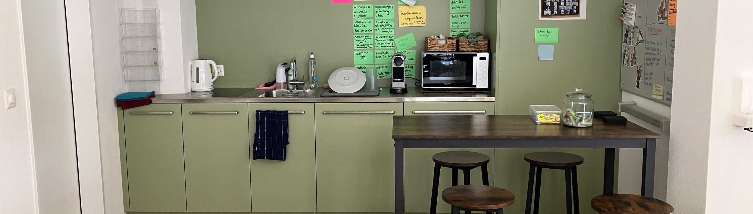 Eine Teeküche mit kleinem Kochfeld, Mikrowelle, Kühlschrank und Kaffeemaschine ergänzt mit einer kleinen Sitzgelegenheit laden zur Kaffeepause ein. Und für Ihre persönlichen Gegenstände stehen Schliessfächer zur Verfügung.