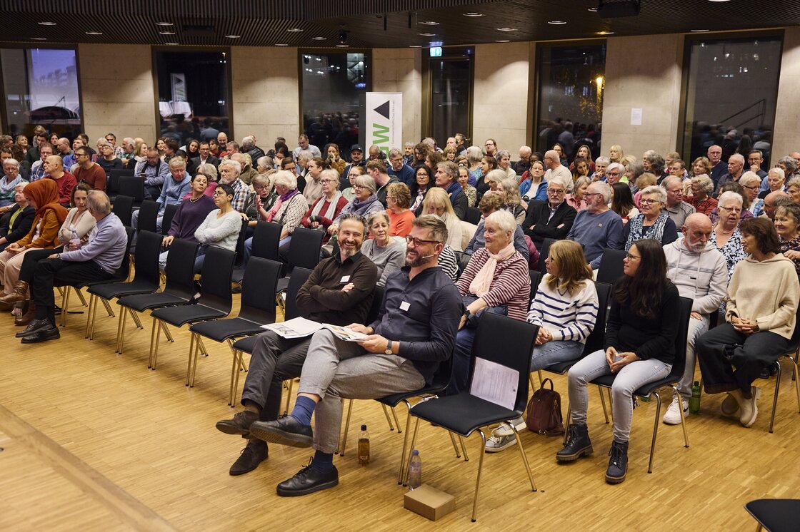 Das Motto der HGW-Mieterinformationsveranstaltung: «Zusammenleben im Wandel – Engagement hat viele Gesichter». Zum ersten Mal findet die Veranstaltung hybrid statt. Rund 300 Gäste sind vor Ort, 70 weitere nehmen online teil. Zukunftsforscher Stephan Sigrist beleuchtet, wie äussere Entwicklungen das Wohnen verändern. Auf dem Podium berichten Bewohner:innen, was Engagement für sie bedeutet.