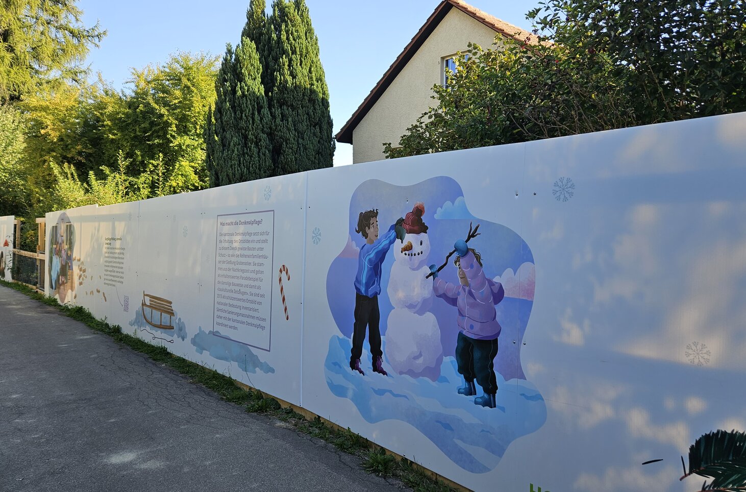 Warum nicht einen Sonntagsspaziergang machen entlang unserer Bauwand? Sie finden zahlreiche Informationen über die HGW sowie über die Siedlung Grabenacker. Die vier QR-Codes entlang der Bauwand liefern Ihnen noch viele zusätzliche Details. Ab November erhaschen Sie über die eingebauten Gucklöcher einen Einblick ins Baugeschehen. Wir finden unsere Bauwand toll - wir hoffen Sie auch!