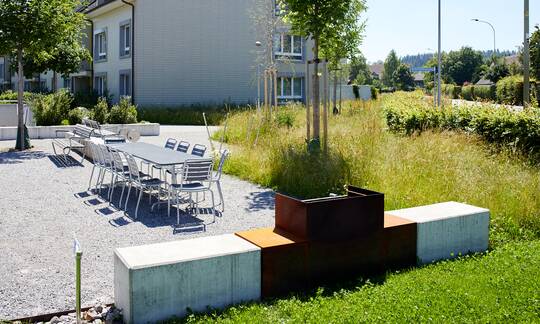 Der Aussenraum der Siedlung ist grosszügig konzipiert und bietet diverse Möglichkeiten, die Natur zu geniessen – egal ob bei einem gemütlichen Höck, beim gemeinsamen Grillieren, beim Sport, auf dem Spielplatz oder in Form eines kleinen Spaziergangs.